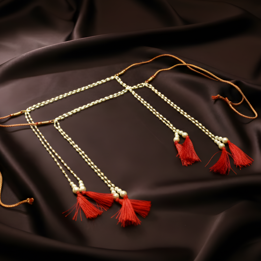 Expertly hand crafted and adorned with high quality pearls, the Mundavalya is the perfect accessory for every wedding. With a luxurious gold plated finish, it adds a touch of elegance to any traditional attire. Make a statement on your special day with this must-have piece.