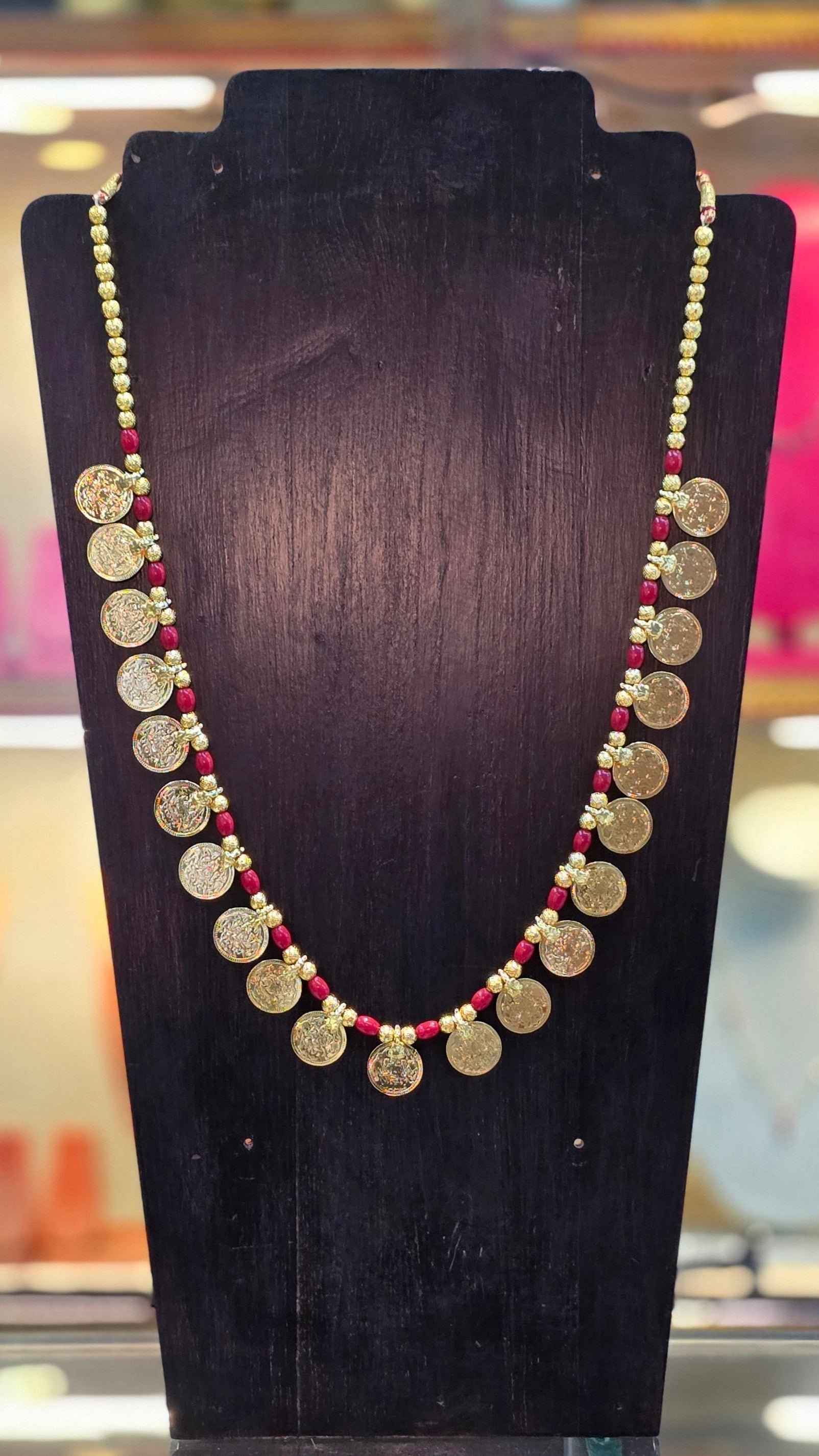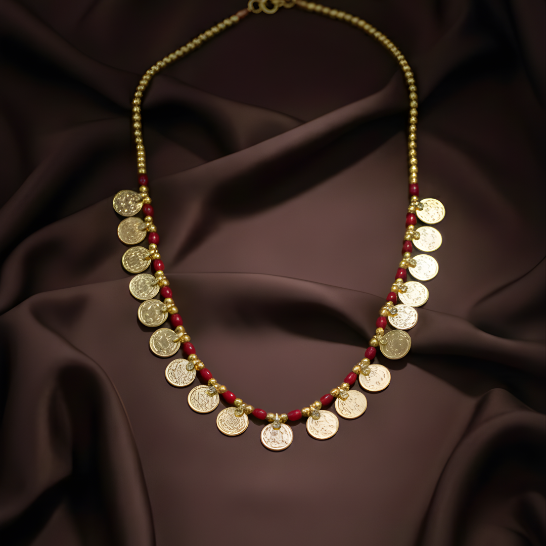 This exquisite necklace showcases authentic traditional design highlighted with natural coral beads (पावले) and a premium gold plating with anti-tarnish finish for long-lasting brilliance.